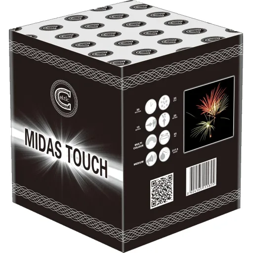 25 shot cake. Green, red and white strobe mines all lead into large bursts of golden brocades with colour strobes.